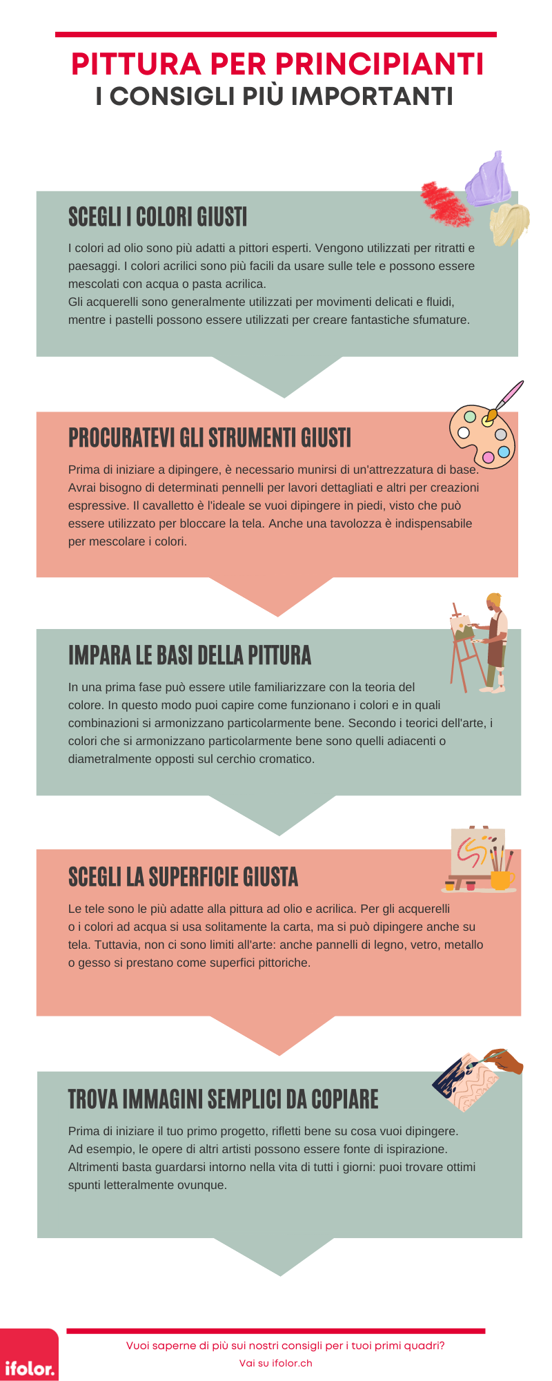 Ti interessa l'arte e vuoi dare sfogo alla tua creatività? Allo stesso tempo non sai da dove cominciare e con che cosa? Nessun problema! In questo articolo, ifolor ti offre una panoramica dettagliata su come imparare a dipingere con facilità. Che si tratti di acquerello, pastello o pittura a olio, ti presenteremo le tecniche pittoriche fondamentali e ti illustreremo alcuni consigli utili che sicuramente renderanno i tuoi primi quadri un vero e proprio successo.